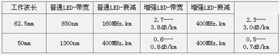 (1) 多模光纤传输设备所采用的光器件是LED,通常按波长可分为850nm和1300nm两个波长,按输出功率可分为普通LED和增强LED----ELED。多模光纤传输所用的光纤,有62.5mm和50mm两种。不同波长的光在多模光纤上的传输特性如下: