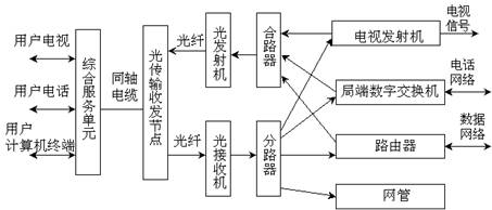 有线电视台的电视信号、公用电话网来的话音信号和数据网的数据信号送入合路器形成混合信号后,经电视台局端光发射机通过光缆线路送至各个小区光传送收发节点,再经过同轴电缆分配网络送至用户本地综合服务单元,并分别将电视信号送到电视机,语音信号送到电话,数据信号经综合服务单元内的Cable Modem送到各种用户终端。如多个用户共享1台Cable Modem,则需在本地的Cable Modem中添加一个以太网集线器;若通过一个局域网与Cable Modem相连,在Cable Modem和局域网之间需要接一个路由器。